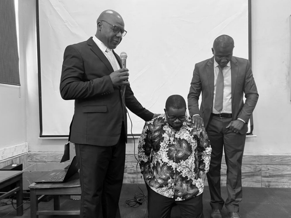 The elders of Kafue Reformed Baptist Church praying for the new pastor and his wife