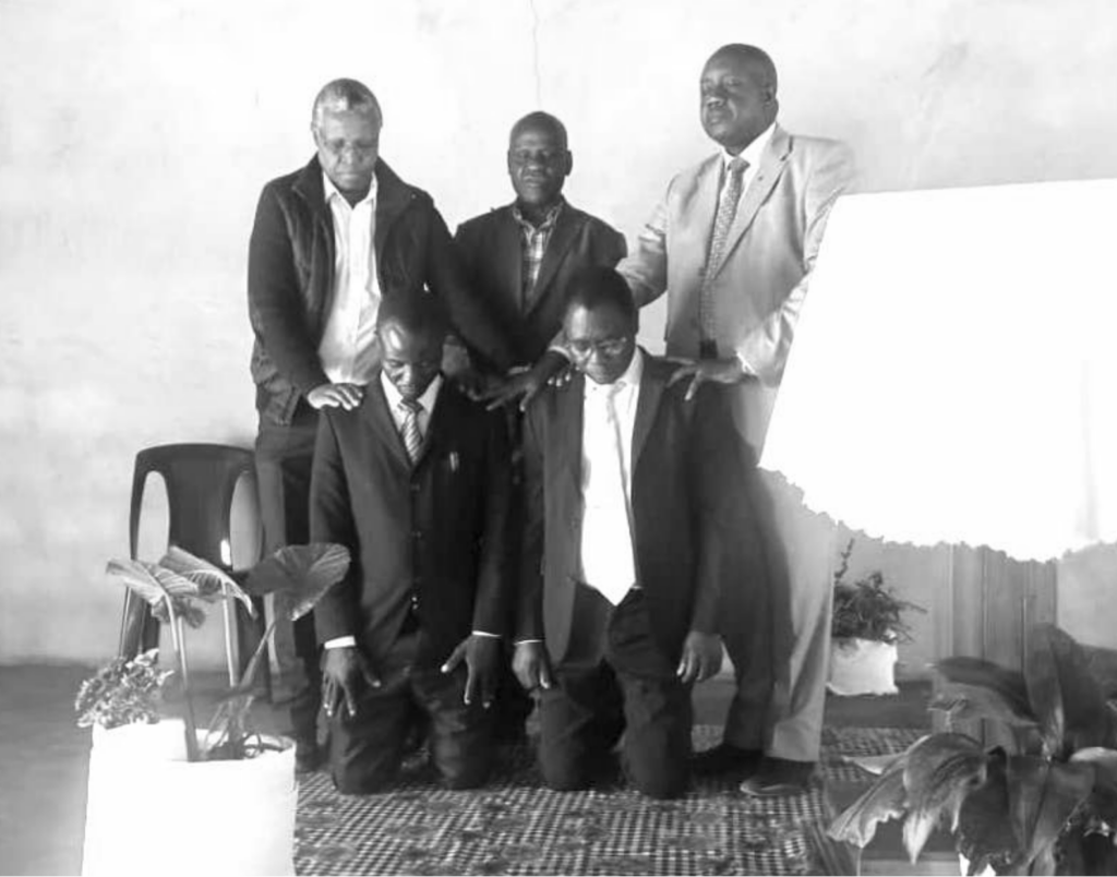 The elders laying hands on Pastor Mwindula Mbewe during the ordination